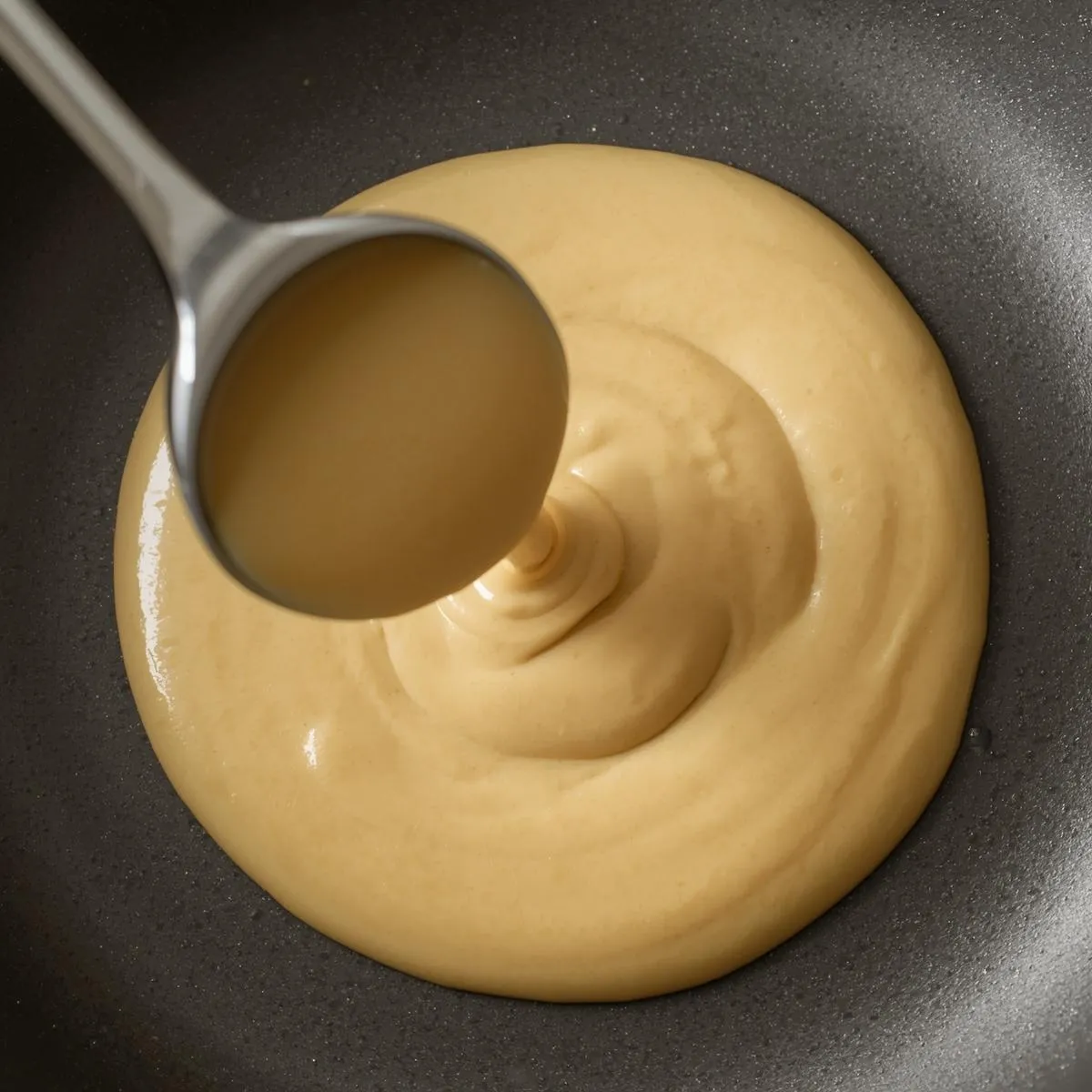 Versa un mestolo di pastella e ruota la padella per coprire uniformemente il fondo.